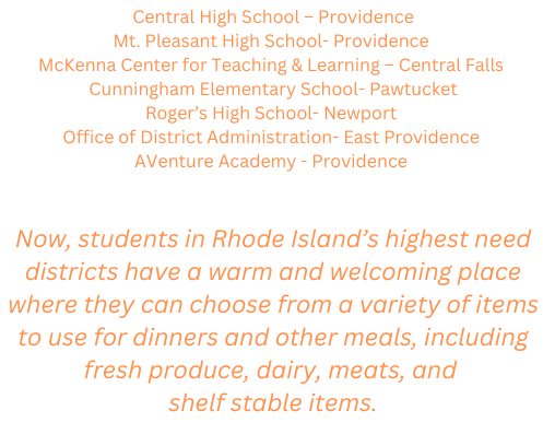 Using data gathered by the Rhode Island Department of Education, We Share Hope identified the five highest need districts in Rhode Island (Central Falls, Providence, Woonsocket, Newport, and Pawtucket.) In these districts, at least 61% of students are classified as “economically disadvantaged.” Although students receive breakfast and lunch at school, many experience a meal gap at night, on weekends, and during school vacations. To address this need, We Share Hope provides schools with the infrastructure to create and host its own onsite food pantry. This includes appliances, shelving, and biweekly food deliveries.